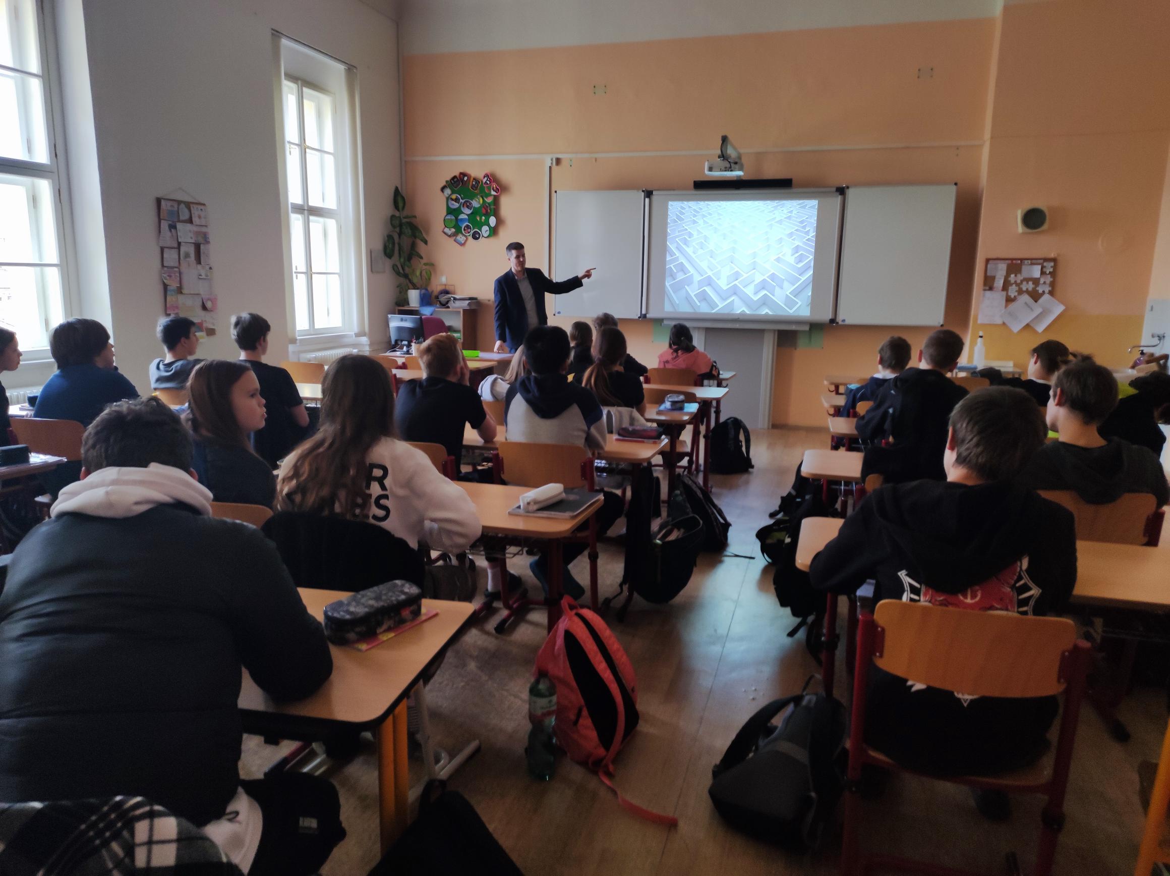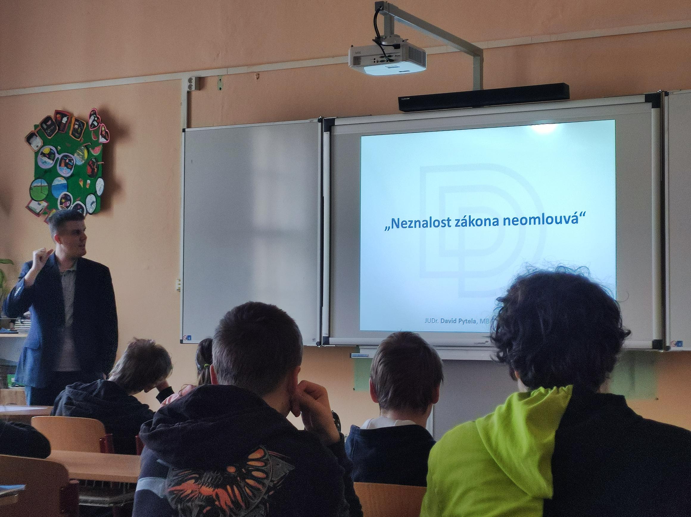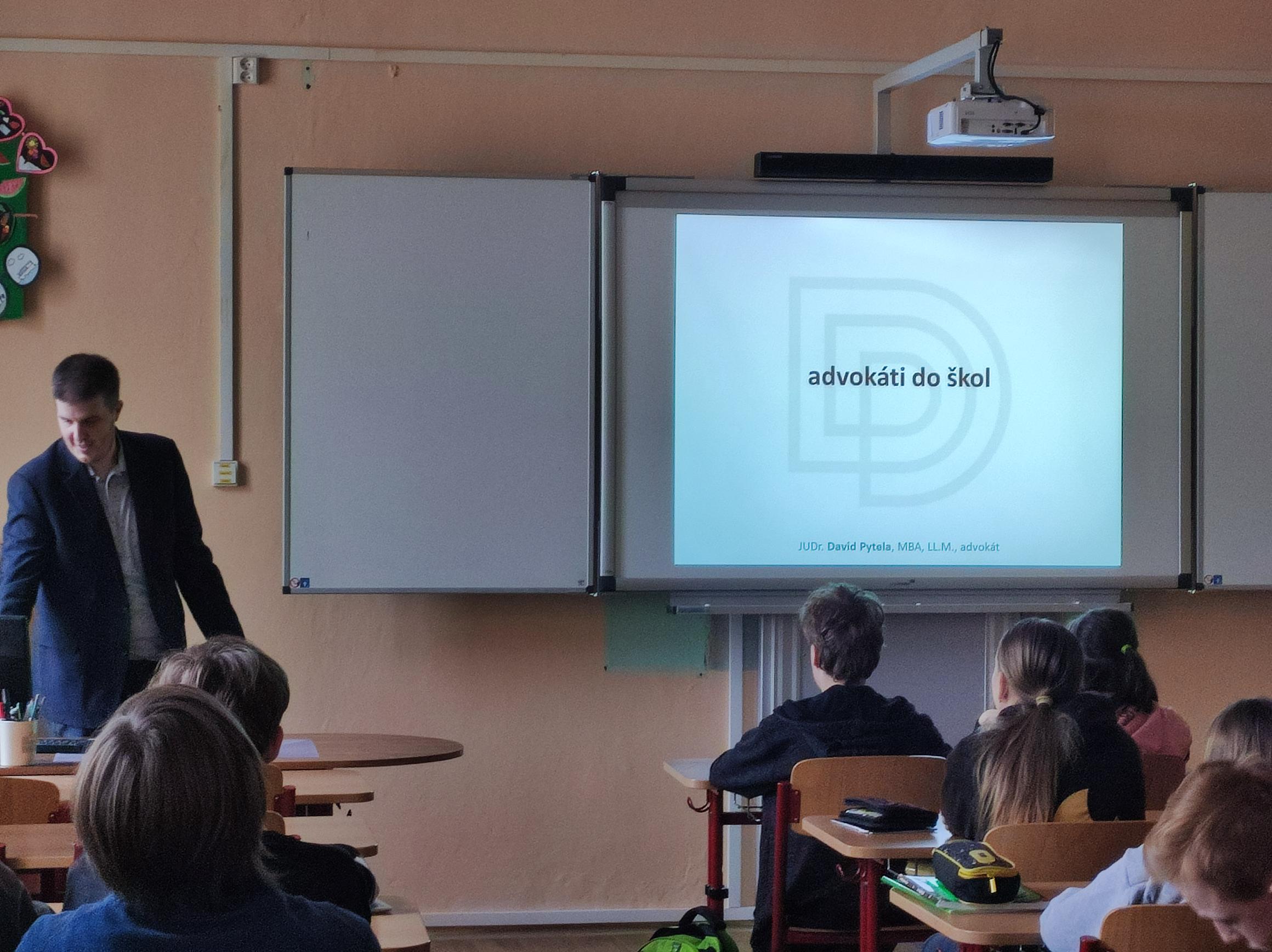 V pondělí 7. listopadu měli žáci devátého ročníku jedinečnou příležitost setkat se s advokátem, který je seznámil se základními pojmy z oblasti práva. JUDr. David Pytela, MBA, LL.M., předal důležité informace zajímavou formou, která žáky bavila. Připomněli si například, že „neznalost zákona neomlouvá“. Více o projektu se můžete dozvědět zde. Vyučující zapojení do tohoto projektu hodnotí velice kladně. Žáci s tímto mimořádným ozvláštněním výchovy k občanství byli spokojeni taktéž.