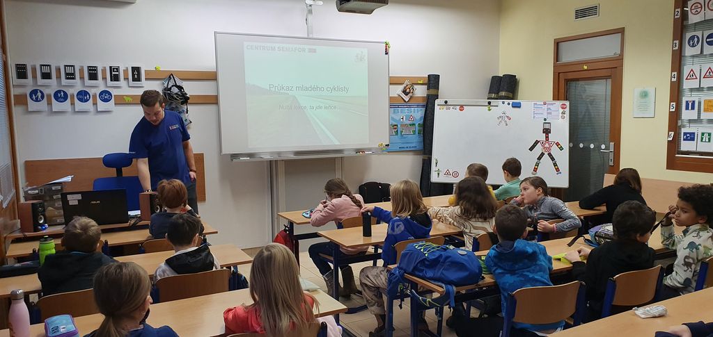 Lektor centra Semafor si s dětmi povídal o bezpečném chování v dopravě. Prostřednictvím různých aktivit, výukových videí si děti ujasnily pravidla pro bezpečný pohyb chodců, pohyb na cyklostezkách i chování při přepravě, či první pomoc v dopravě. Velkým zážitkem byl nácvik srdeční masáže s resuscitační figurínou.