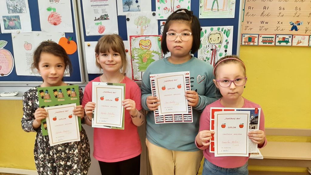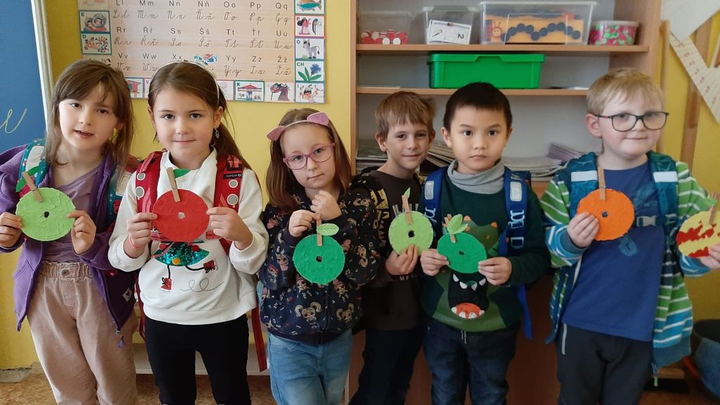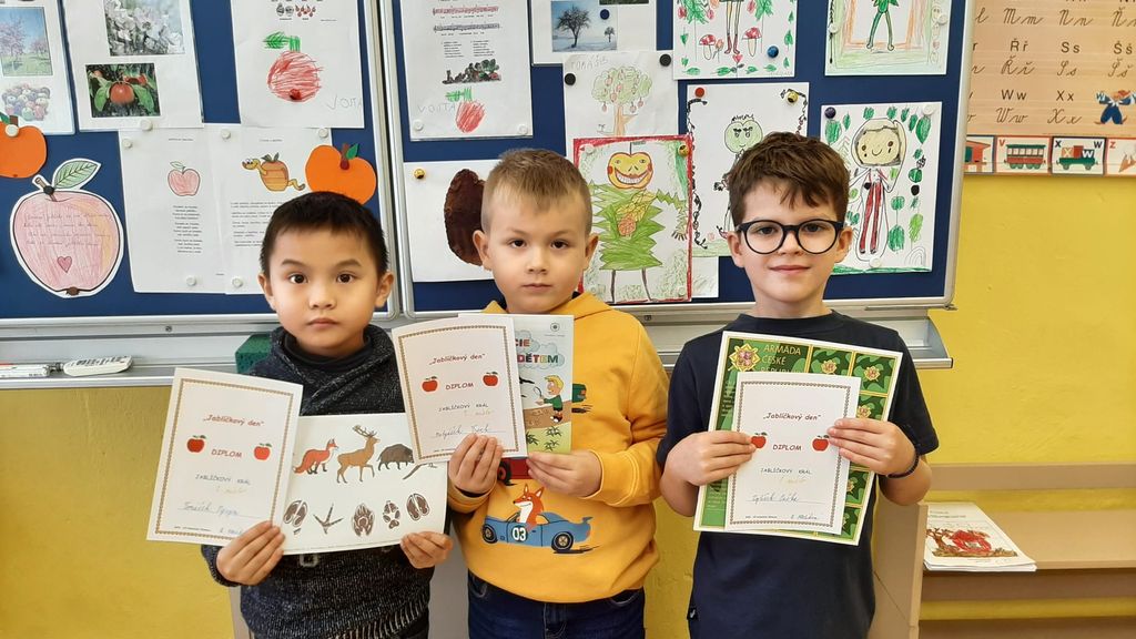 V pátek 11.11. si děti užily netradiční vyučování na téma jablíček a jabloní. Poslechly si pohádku „O zatoulaném jablíčku“ a celé dopoledne plnily nejrůznější úkoly (jablíčkovou matematiku, bludiště, dokreslování jablíček…). Zasoutěžili jsme si o nejkrásnější jablíčko a na konci dne jsme zvolili jablíčkového krále a královnu. Nechybělo ani tvoření – nakreslili jsme skřítka Jablečníčka a vyrobili si vlastní jablíčko. Naučili jsme se veselou říkanku o červíčkovi a zatančili jsme si u písničky „Jablečná“. Díky hodným maminkám jsme si pochutnali na jablíčkových dobrotách a nechyběl ani přípitek jablečným džusem. A co nás nejvíc překvapilo? Jak vypadá granátové jablko po rozkrojení a jak chutná jeho šťáva. Byl to den plný zábavy i poznávání.