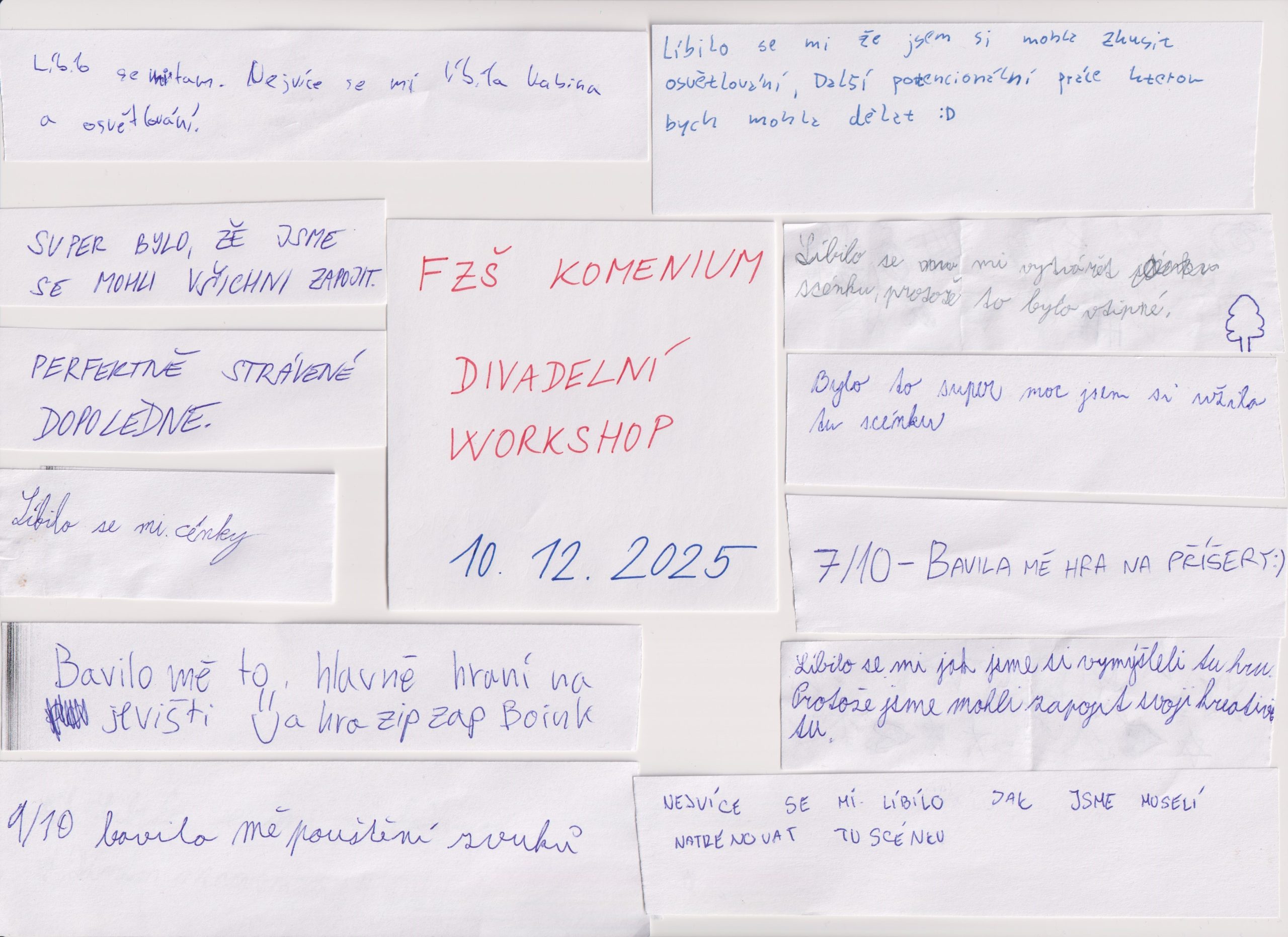 Sedmá třída se dne 10. prosince zúčastnila zcela unikátního workshopu v Divadle Tramtárie, v němž si vyzkoušela různé dramatické hry, práci s literárním textem a jeho divadelním zpracováním. Zapojili se všichni, ať už jako herci na jevišti, diváci v hledišti nebo jako technická opora v zákulisí. Lektoři dokázali podnítit zájem většiny žáků pro divadelní prostředí. Níže uvádíme také autentickou zpětnou vazbu aktérů. Děkujeme Divadlu Tramtárie za jedinečný zážitek, na nějž budeme dlouho vzpomínat.