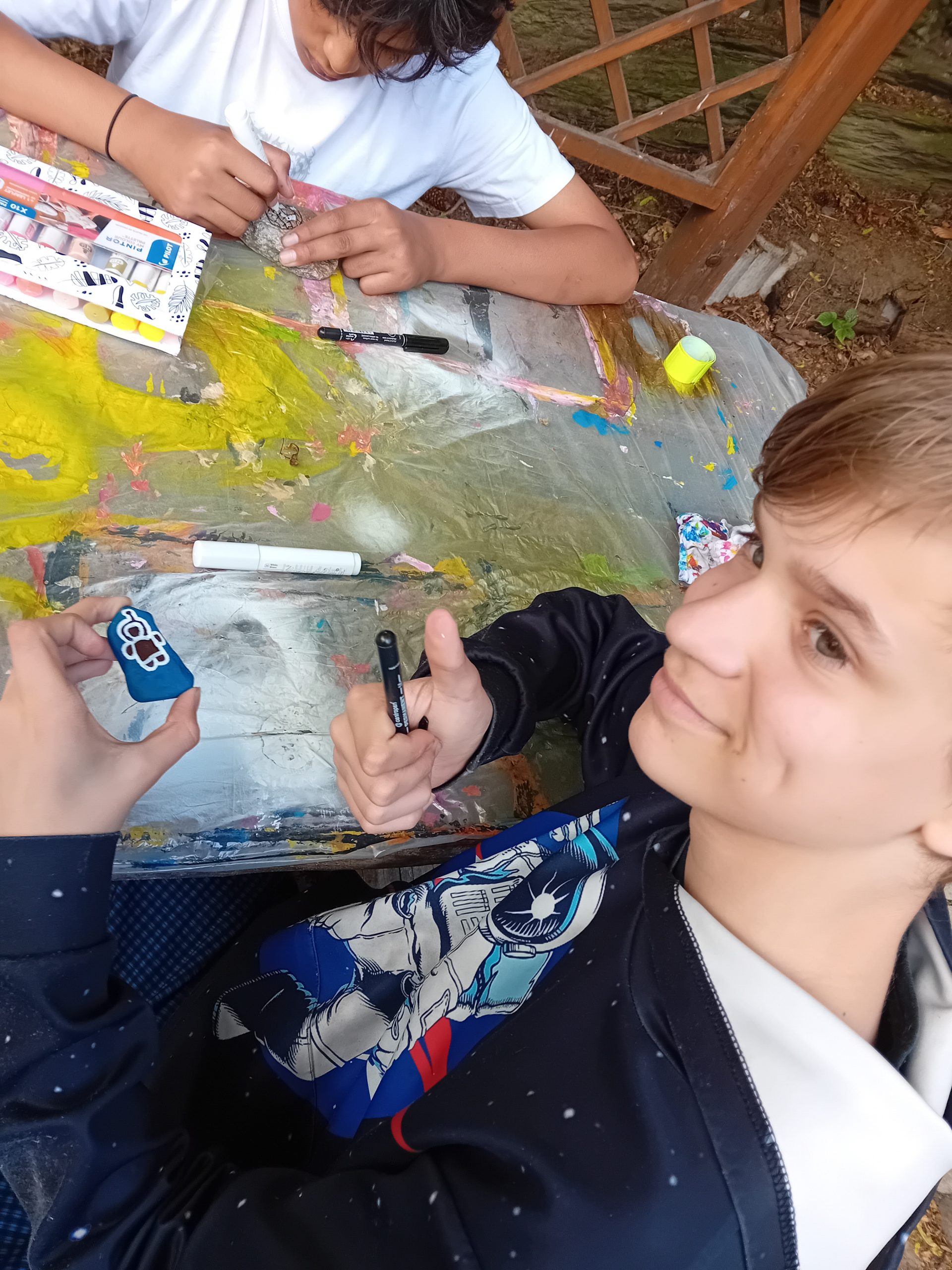 Ve středu jsme malovali akrylovými barvami a fixami na kamínky. Každý žák si vytvořil památku na krajinářský kurz. Večer jsme si společně udělali táborák, při němž byly dětem rozdány diplomy a ceny, také jsme si společně zazpívali při kytaře. Všichni jsme si pobyt náramně užili, počasí nám přálo. Vše se linulo v duchu přátelské a stmelené atmosféry. Děti si zkusily, jaké to je, tvořit mimo školu, třídu, v krásné přírodě. Plny podnětů a inspirace se nechaly unášet přírodními vjemy.