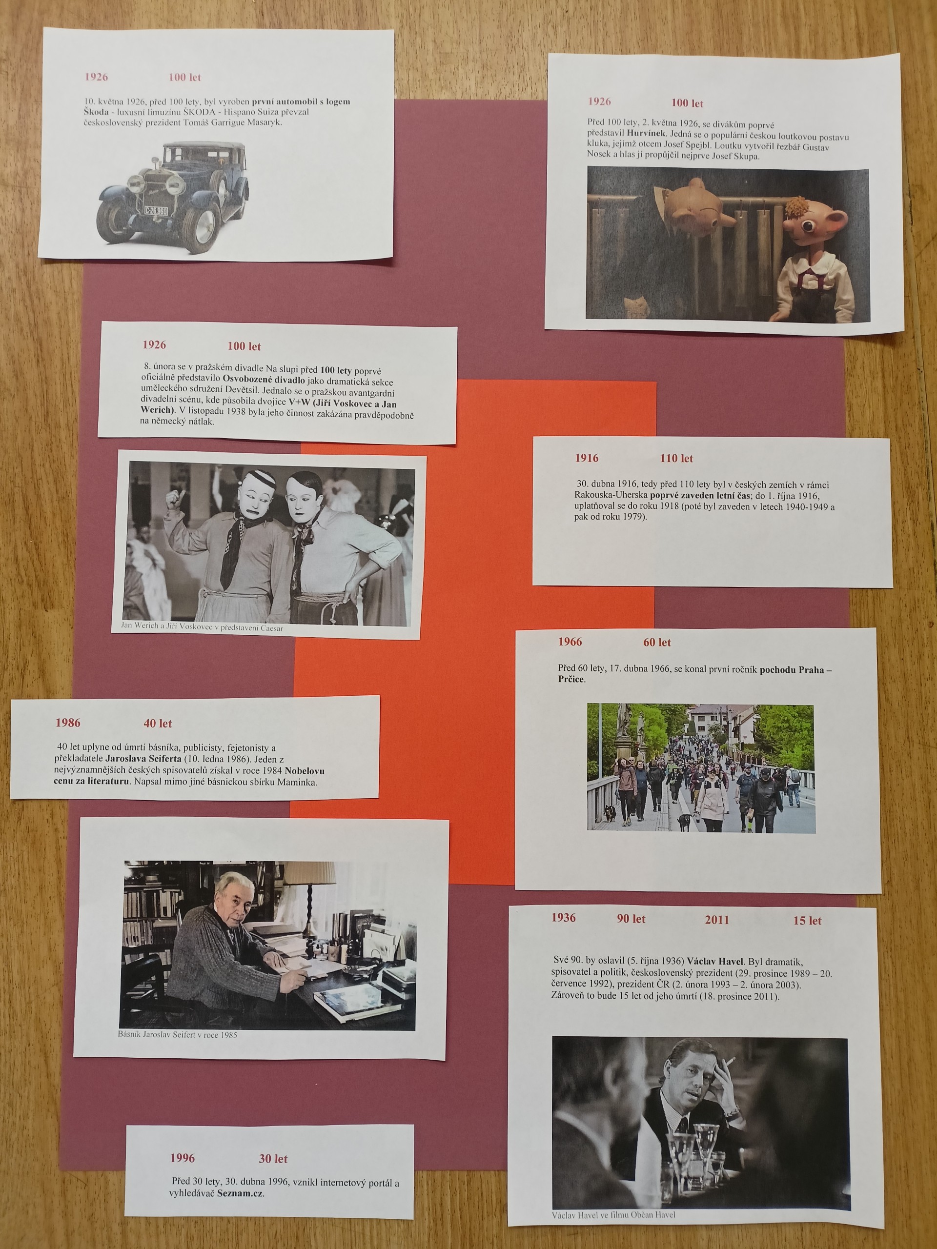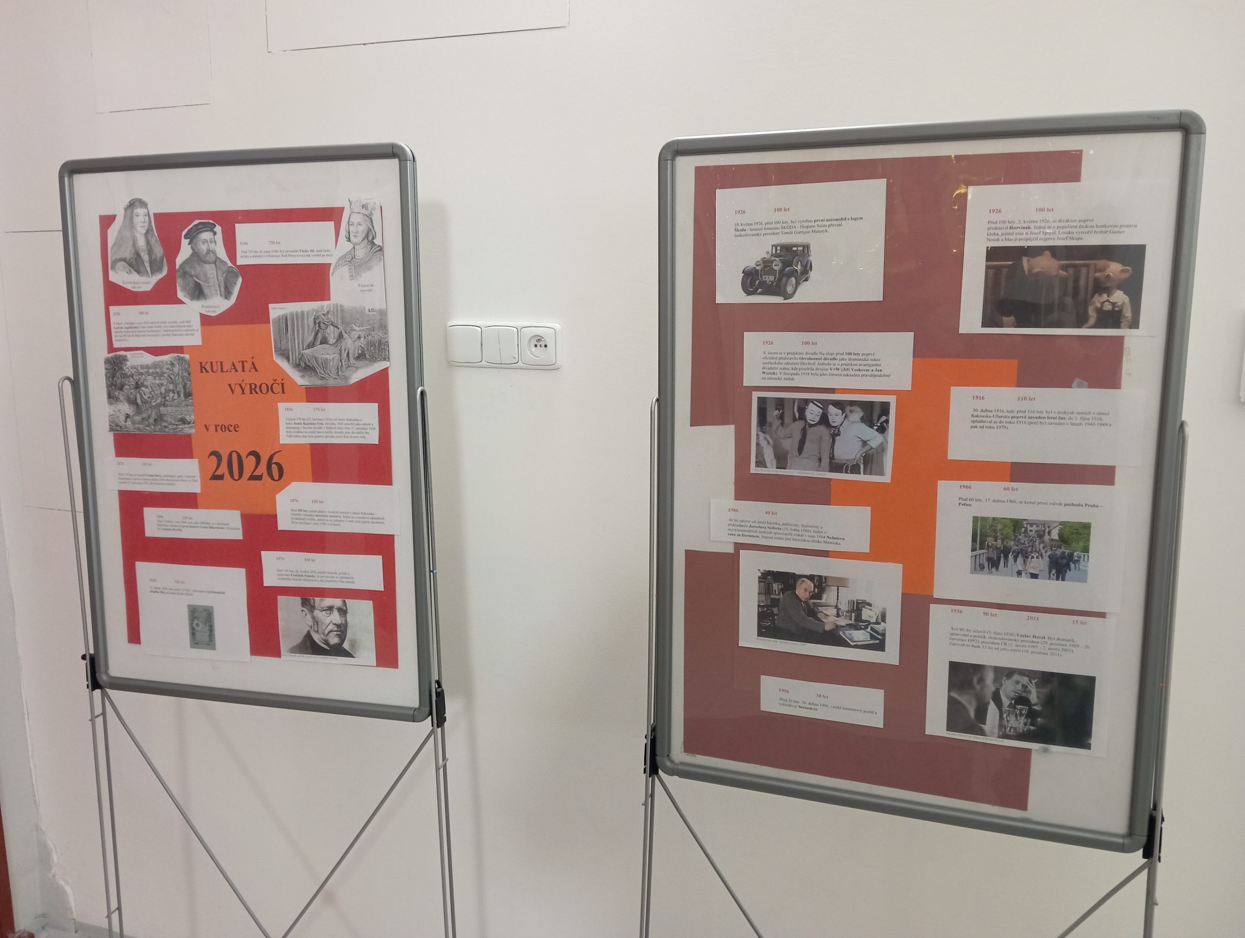 Naše škola dbá také na to, aby žáci rozvíjeli své historické myšlení. Kromě vyučovacích hodin mají možnost dozvědět se spoustu informací i přímo v prostorách školy. Například hned u vchodu do budovy se mohou nyní seznámit s kulatými výročí v tomto kalendářním roce. Některé události jsou hodně významné, jiné zase velice zajímavé. Výstavu pro žáky připravila paní učitelka Kašparová.