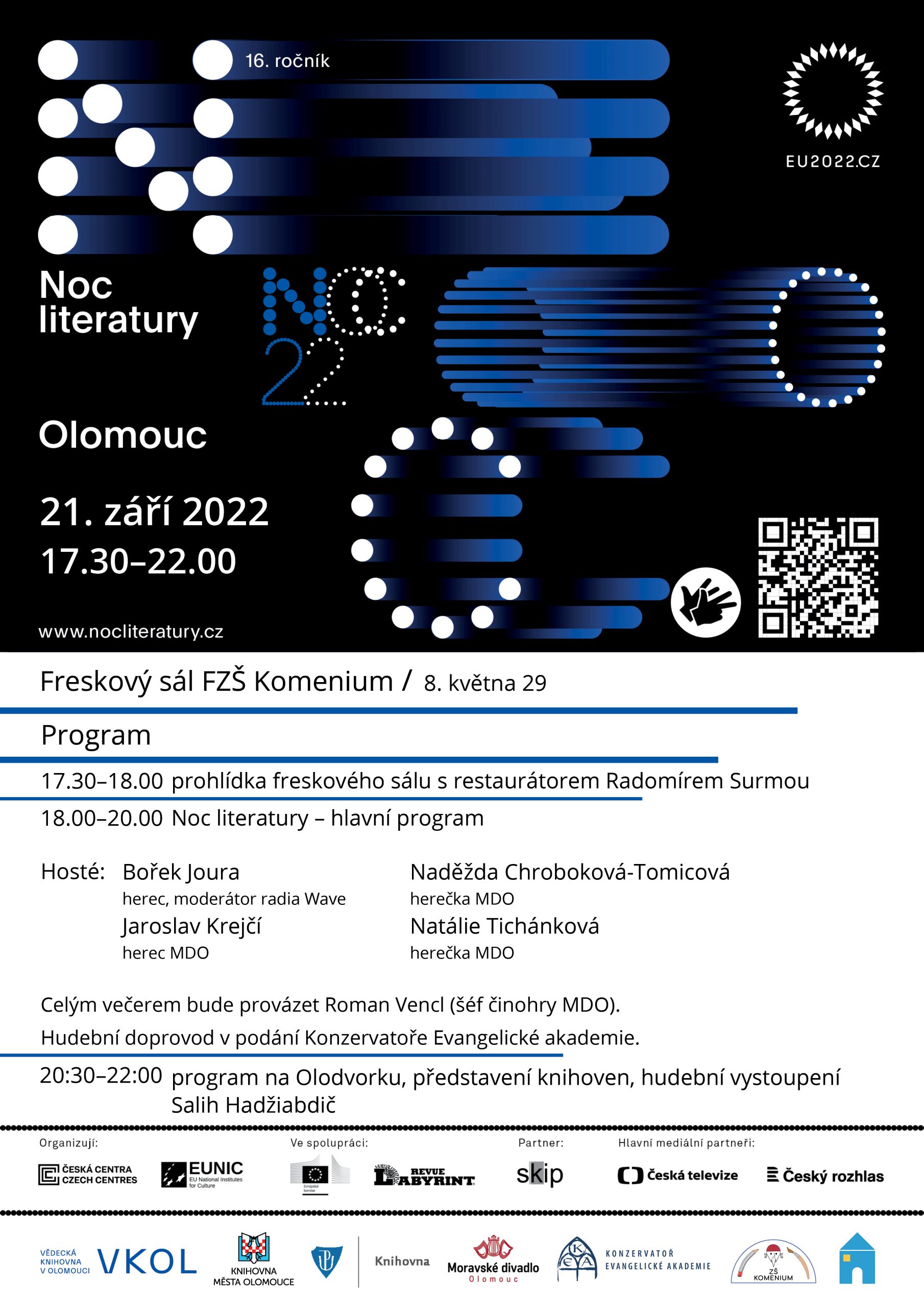 Letošní ročník festivalu proběhne ve středu 21. září 2022 od 17.30 hod. Na organizaci se podílí tři olomoucké knihovny – Vědecká knihovna v Olomouci, Knihovna města Olomouce a Knihovna Univerzity Palackého. Dalšími partnery večera jsou Moravské divadlo Olomouc, FZŠ Komenium, Olodvorek a Konzervatoř Evangelické akademie. Mediálním partnerem je tradičně Český rozhlas Olomouc Návštěvníci se letos mohou kromě ukázek ze soudobé evropské literatury v podání hereckých osobností opět těšit na hudební program a nově i komentovanou prohlídku freskového sálu. Večer bude po skončení oficiální části pokračovat neformálně hudebním vystoupením na Olodvorku. Plakát ke stažení zde