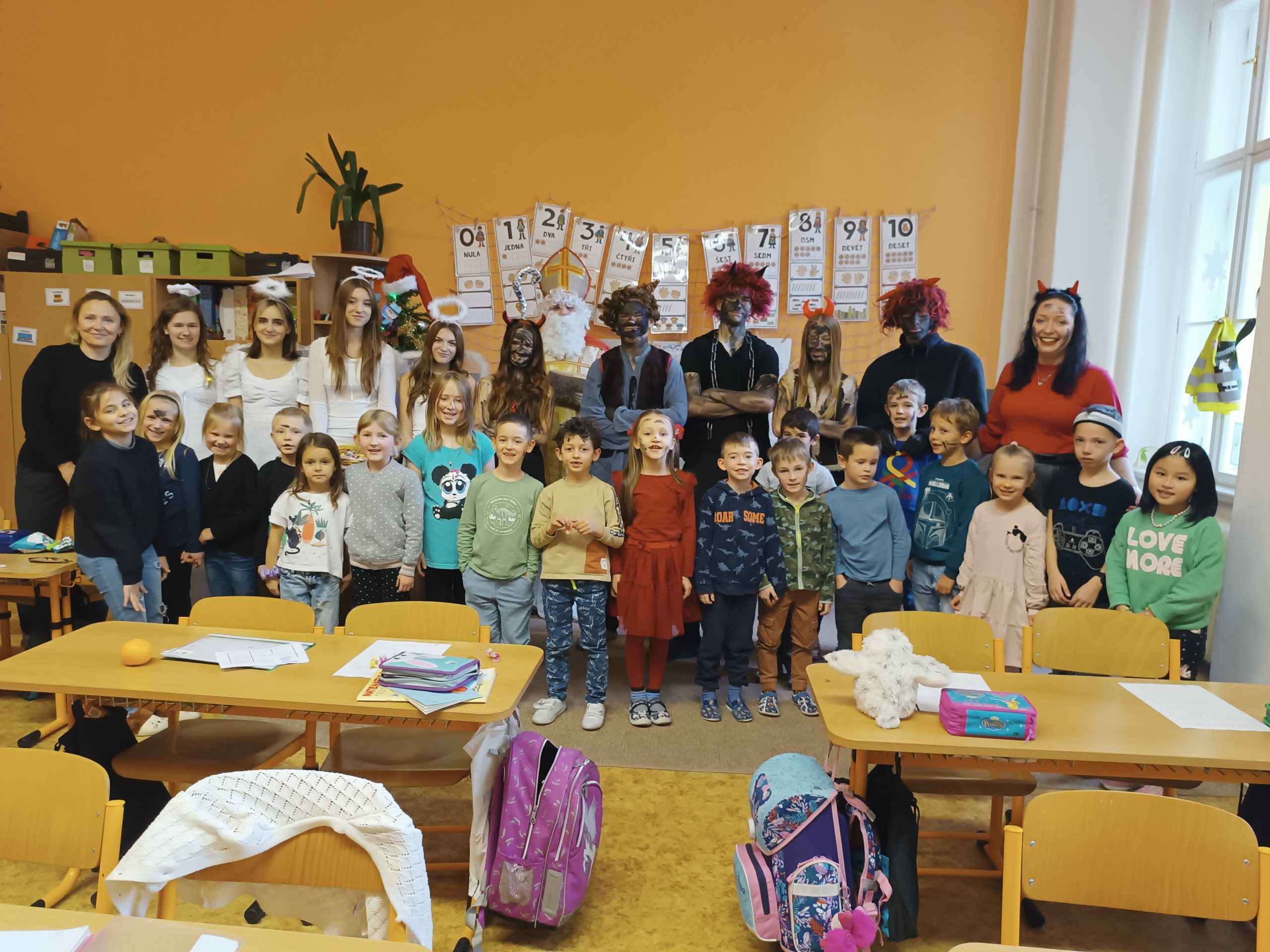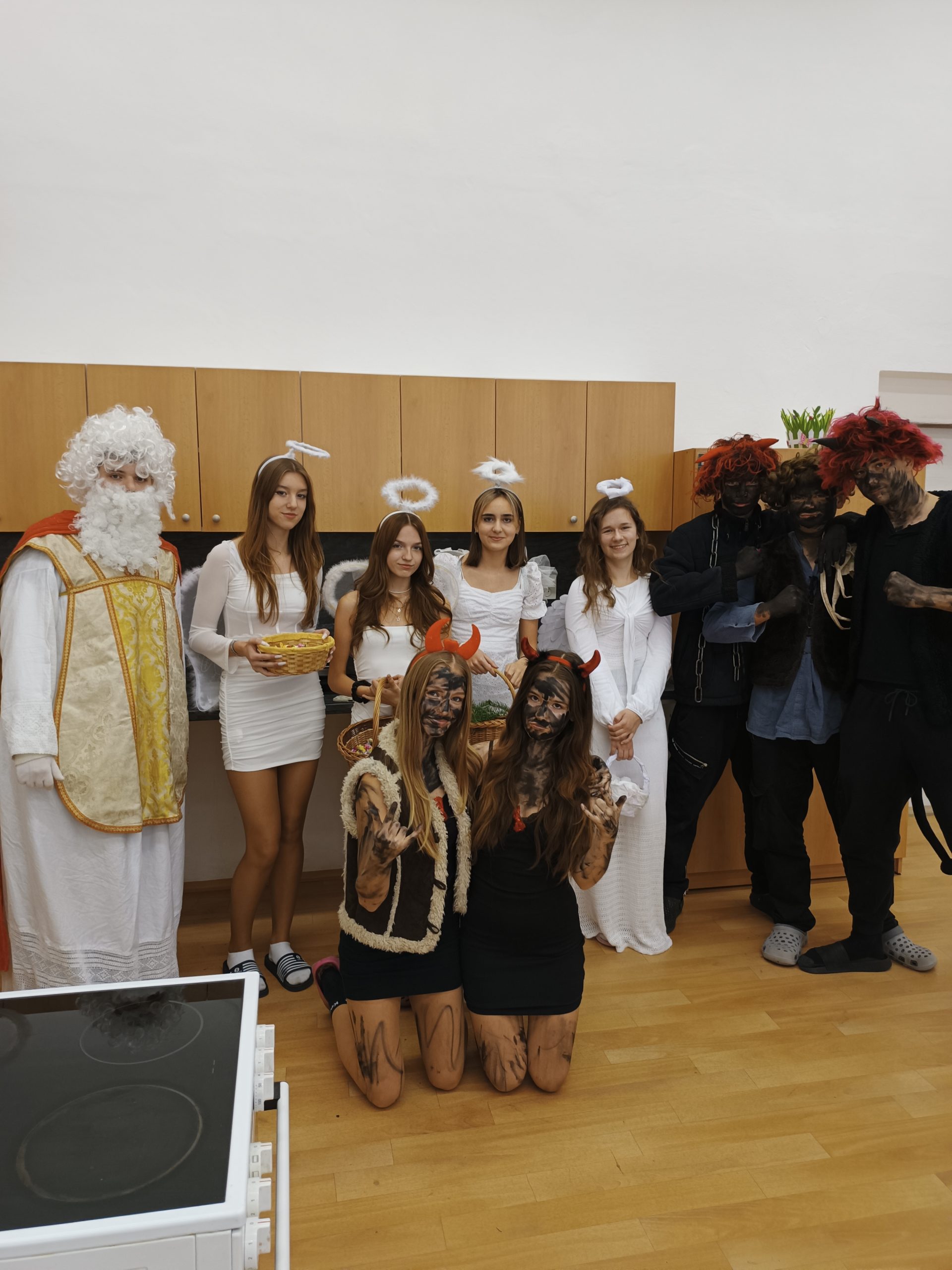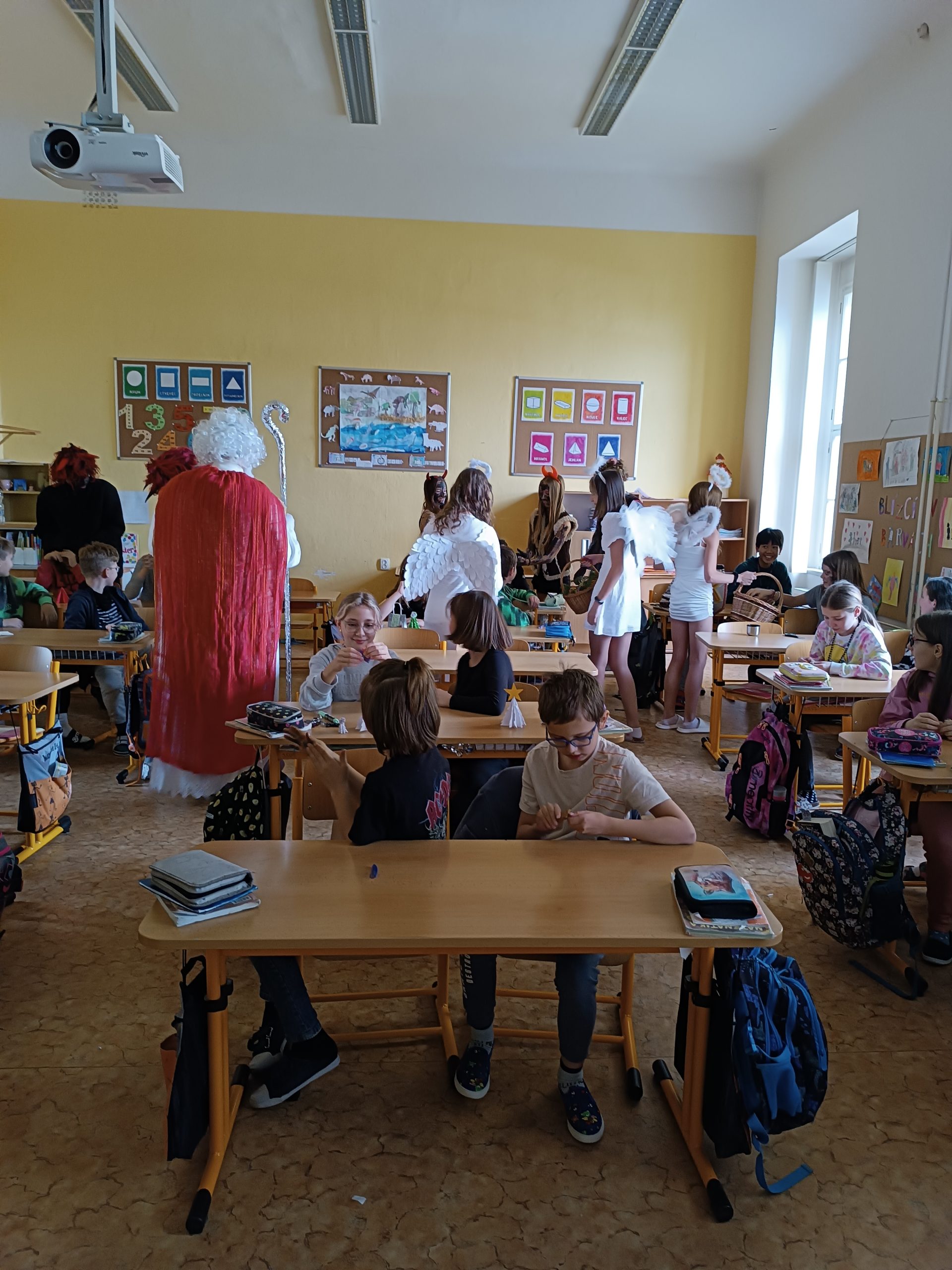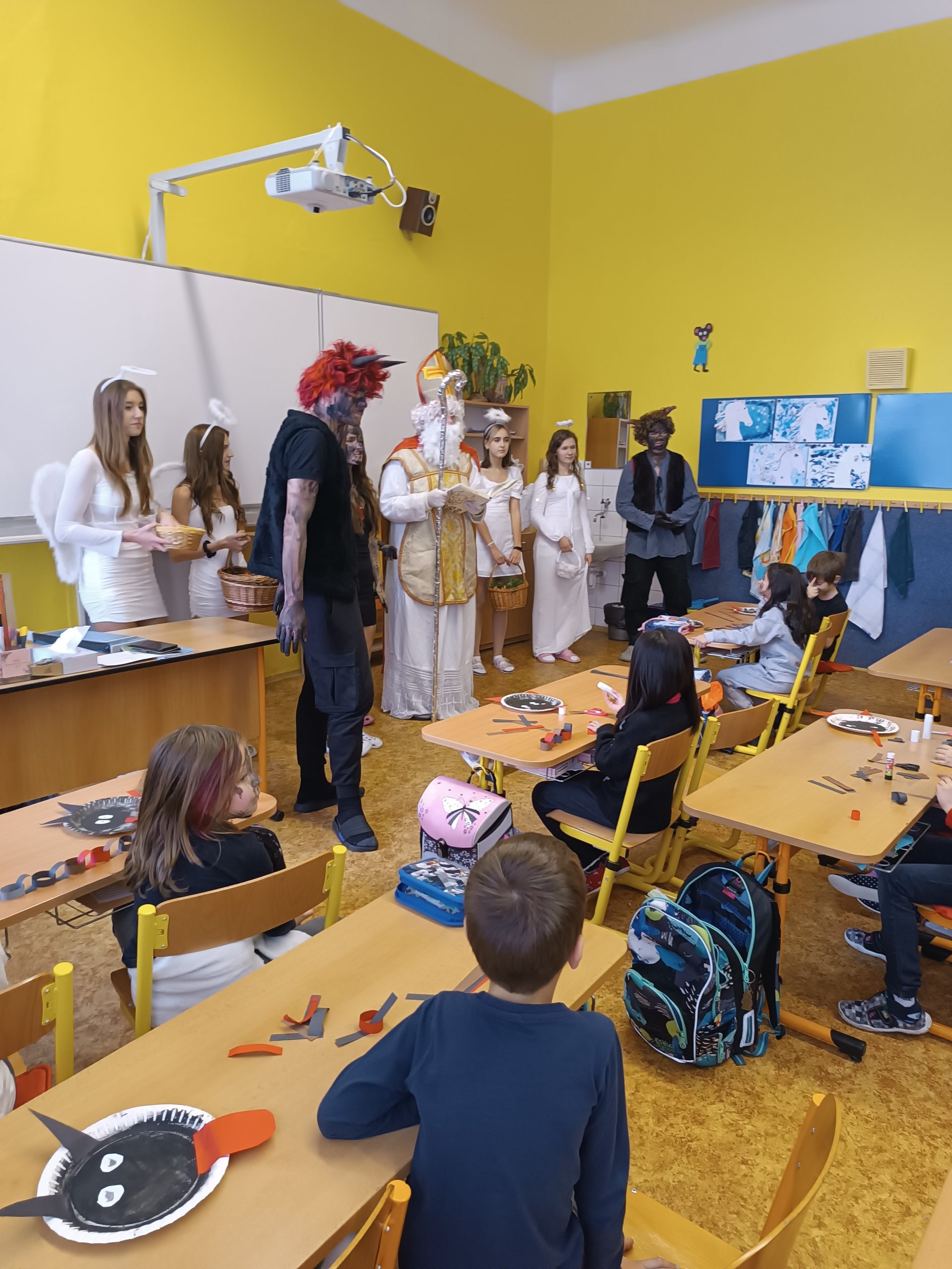 V úterý 5. prosince jsme na naší škole přivítali vzácnou návštěvu, a to samotného Mikuláše. Přivedl s sebou i hodné anděly a zlobivé čerty. Všichni, kdo byli celý uplynulý rok poslušní, dostali drobnou sladkost. Naopak malí i velcí hříšníci z každé třídy odešli s prázdnou. Neunikli ani žáci, ani učitelé. Vše proběhlo v příjemné atmosféře a domů odcházela valná většina z nás s úsměvem na tváři.
