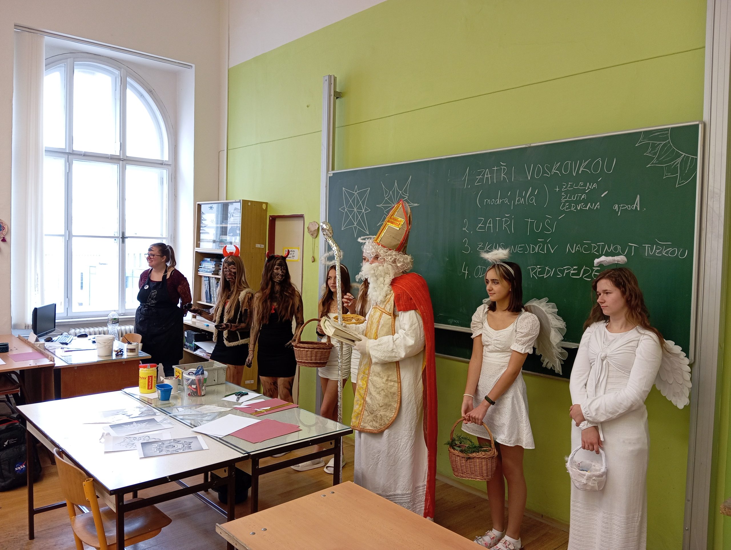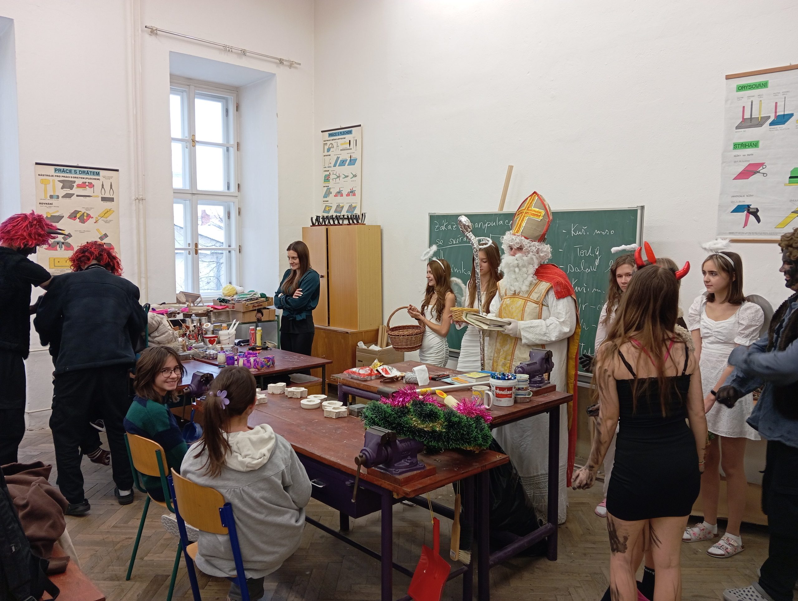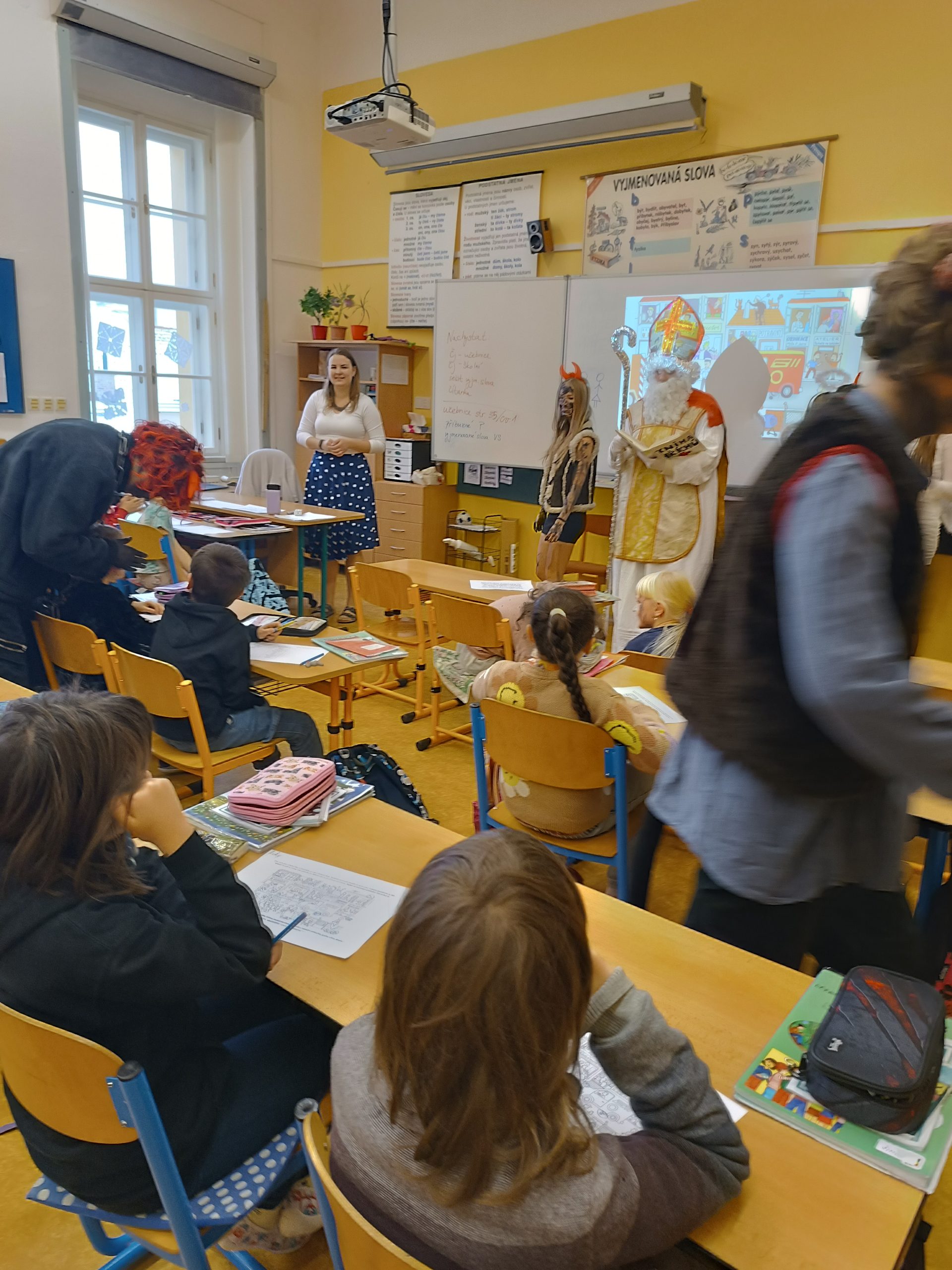 V úterý 5. prosince jsme na naší škole přivítali vzácnou návštěvu, a to samotného Mikuláše. Přivedl s sebou i hodné anděly a zlobivé čerty. Všichni, kdo byli celý uplynulý rok poslušní, dostali drobnou sladkost. Naopak malí i velcí hříšníci z každé třídy odešli s prázdnou. Neunikli ani žáci, ani učitelé. Vše proběhlo v příjemné atmosféře a domů odcházela valná většina z nás s úsměvem na tváři.