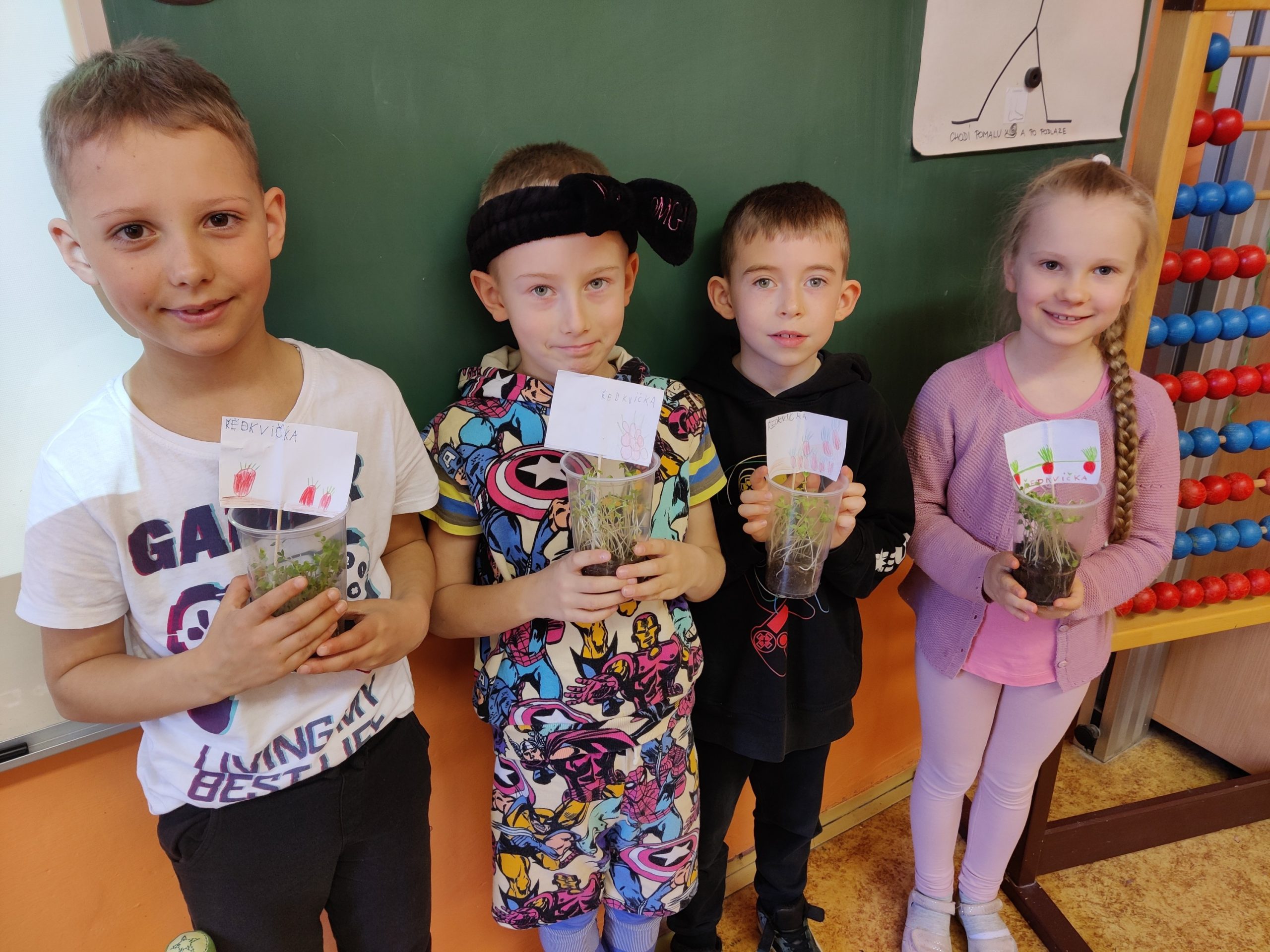 Děti si samy připravily kelímky, nasypaly semínka a den co den pečlivě zalévaly a sledovaly, jak se v nich klube život.