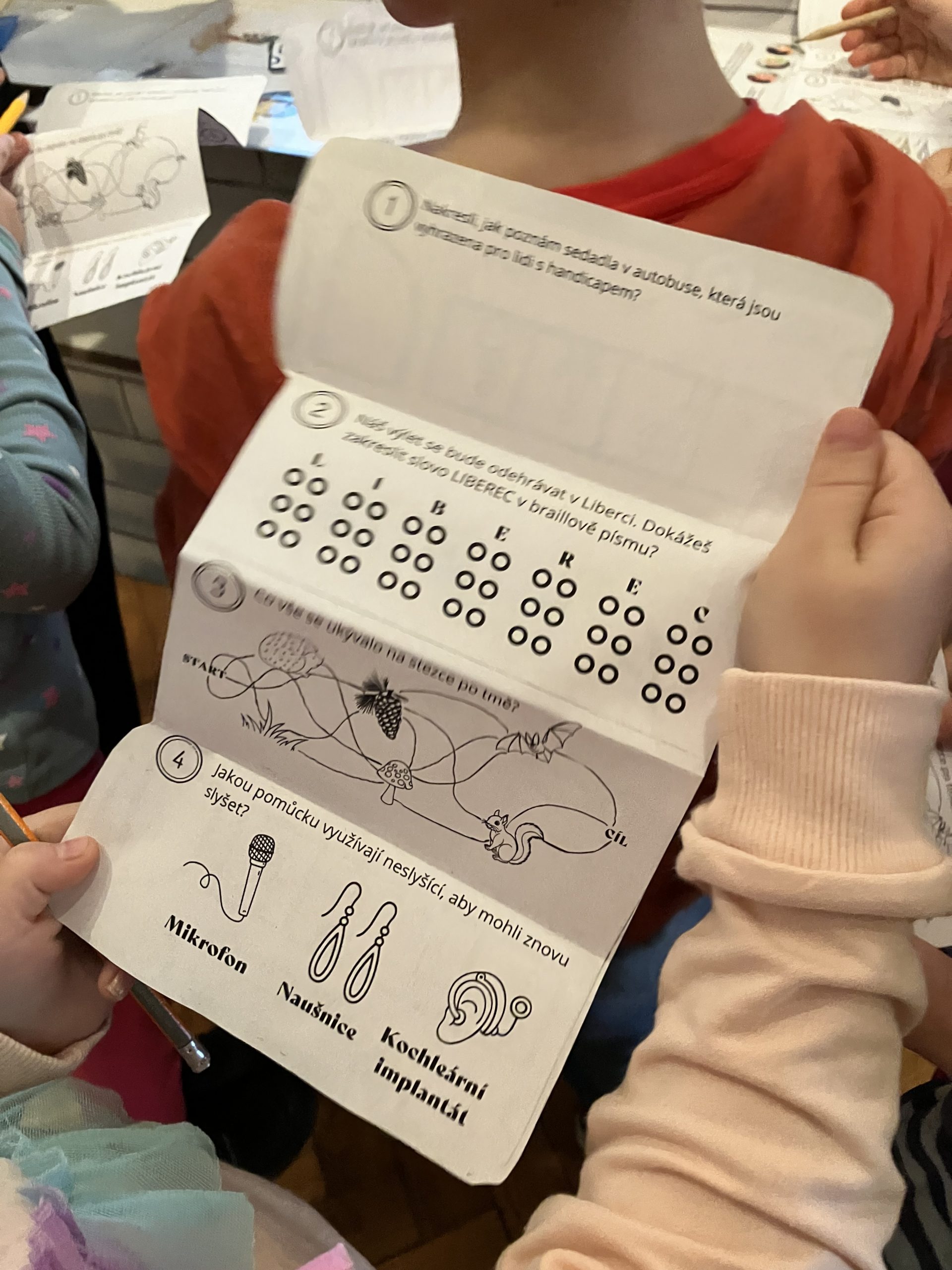 Děti si prošly 7 zajímavých stanovišť, kde si vyzkoušely, jak náročné mohou být různé životní situace, se kterými se denně vypořádávají hendikepovaní lidé. Tyto situace jsou pro zdravého člověka naprosto bezproblémové, proto si nedokáží představit, jak se hendikepovaní lidé cítí. Děti si vyzkoušely pomůcky jejich každodenního života, jako je například Brejlovo písmo, český znakový jazyk, chůze s bílými holemi, jízda na handbiku a projití temným tunelem znesnadňující orientaci. Tato výstava byla pro nás všechny velmi poučná.