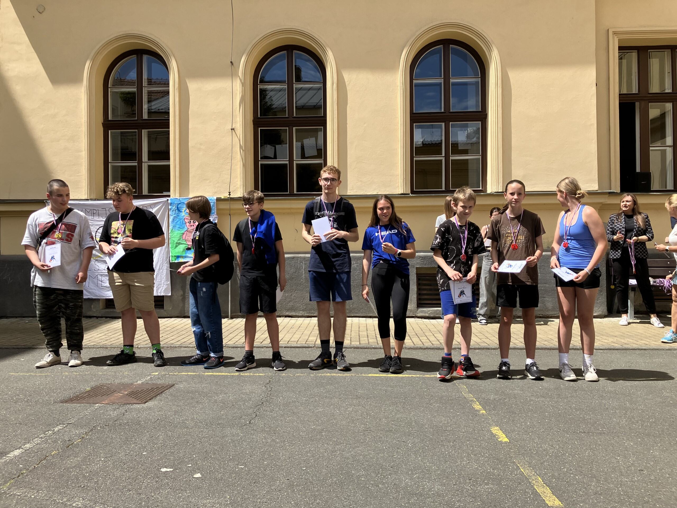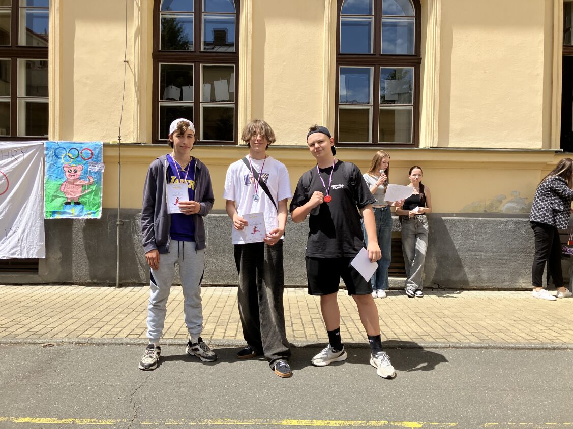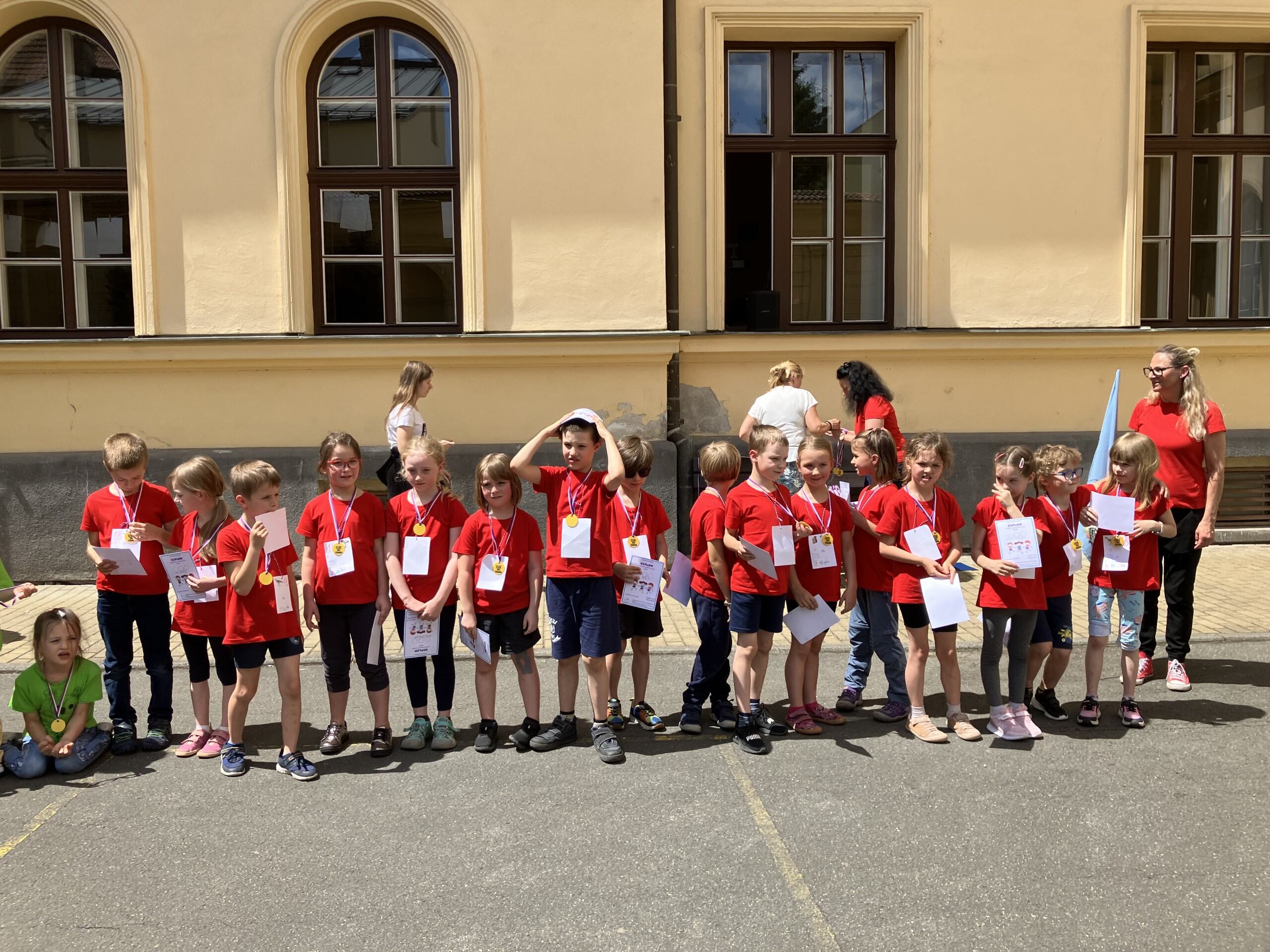 V pátek 7. června proběhl celoškolní sportovní den, do něhož se zapojili žáci mateřské školy, prvního i druhého stupně, ale i většina pedagogického sboru. Nejprve se třídy vystřídaly u různých atletických disciplín – skoku do dálky, běhu a hodu do dálky. Následně se žáci deváté třídy ujali našich nejmenších a pomohli jim s náročnými úlohami, které byly umístěny v nedalekém parku. Jakmile měli všichni splněno, přesunuli se na dvůr školy, kde proběhlo předání posledních medailí, vyhlášení výsledků, uhašení olympijské pochodně a byla pronesena závěrečná slova vedení školy. Díky této školní akci došlo k utužení vztahů a podpoře školního klimatu, ale také radosti z pohybu. Chtěli bychom tímto poděkovat všem žákům, ale také pedagogickému sboru (včetně olympijského výboru) za aktivní zapojení do naší první školní olympiády. Děkujeme!