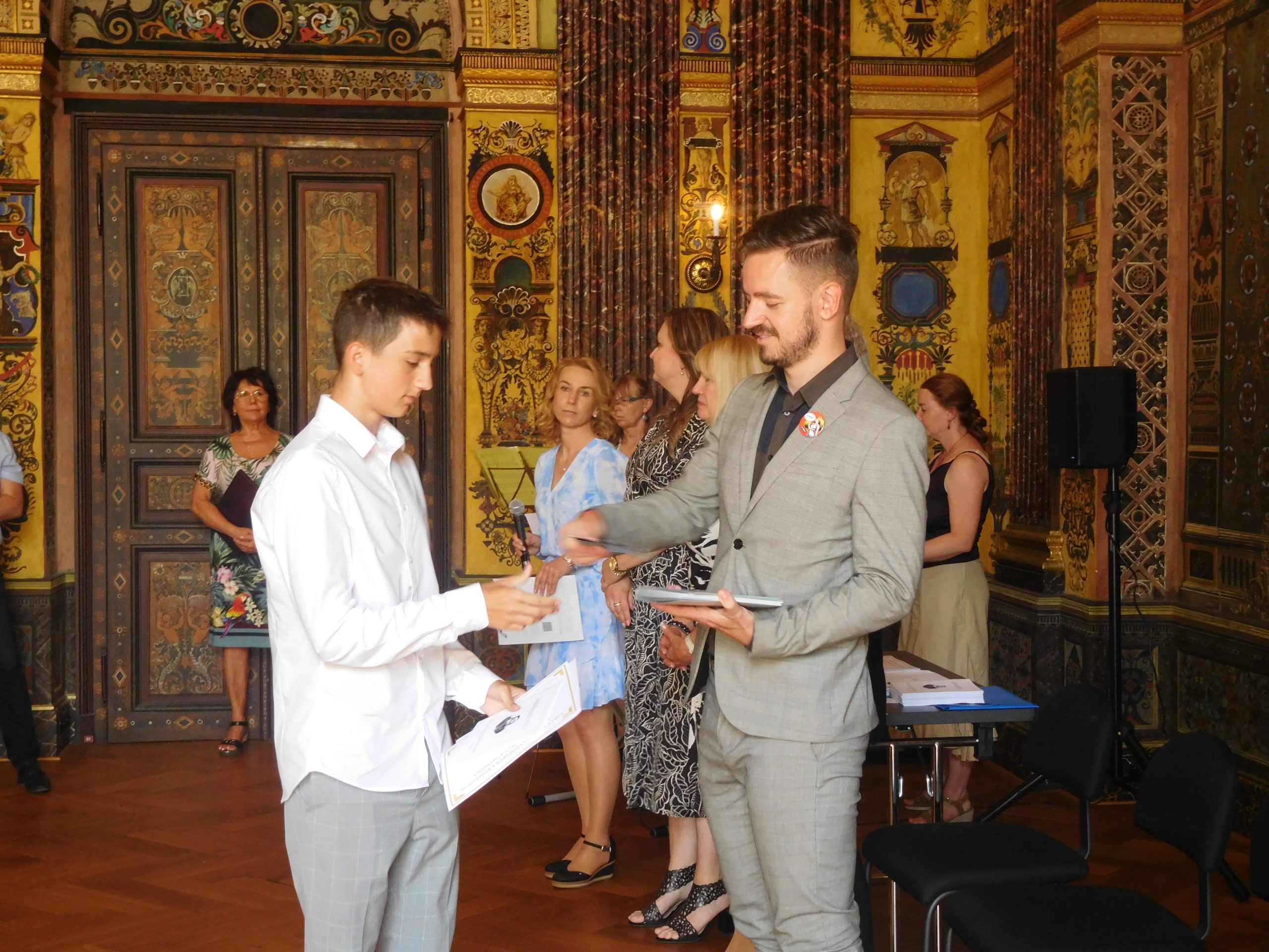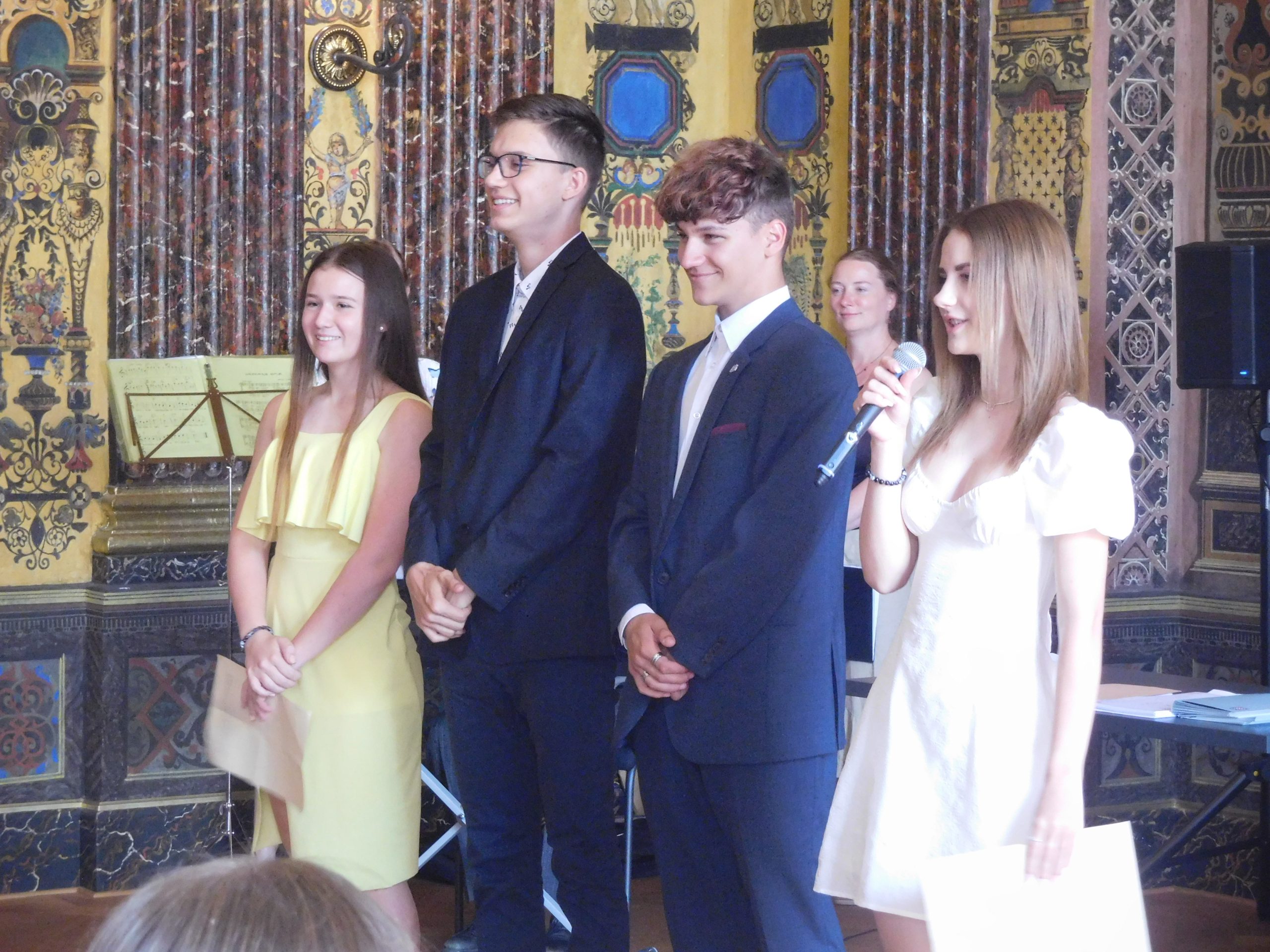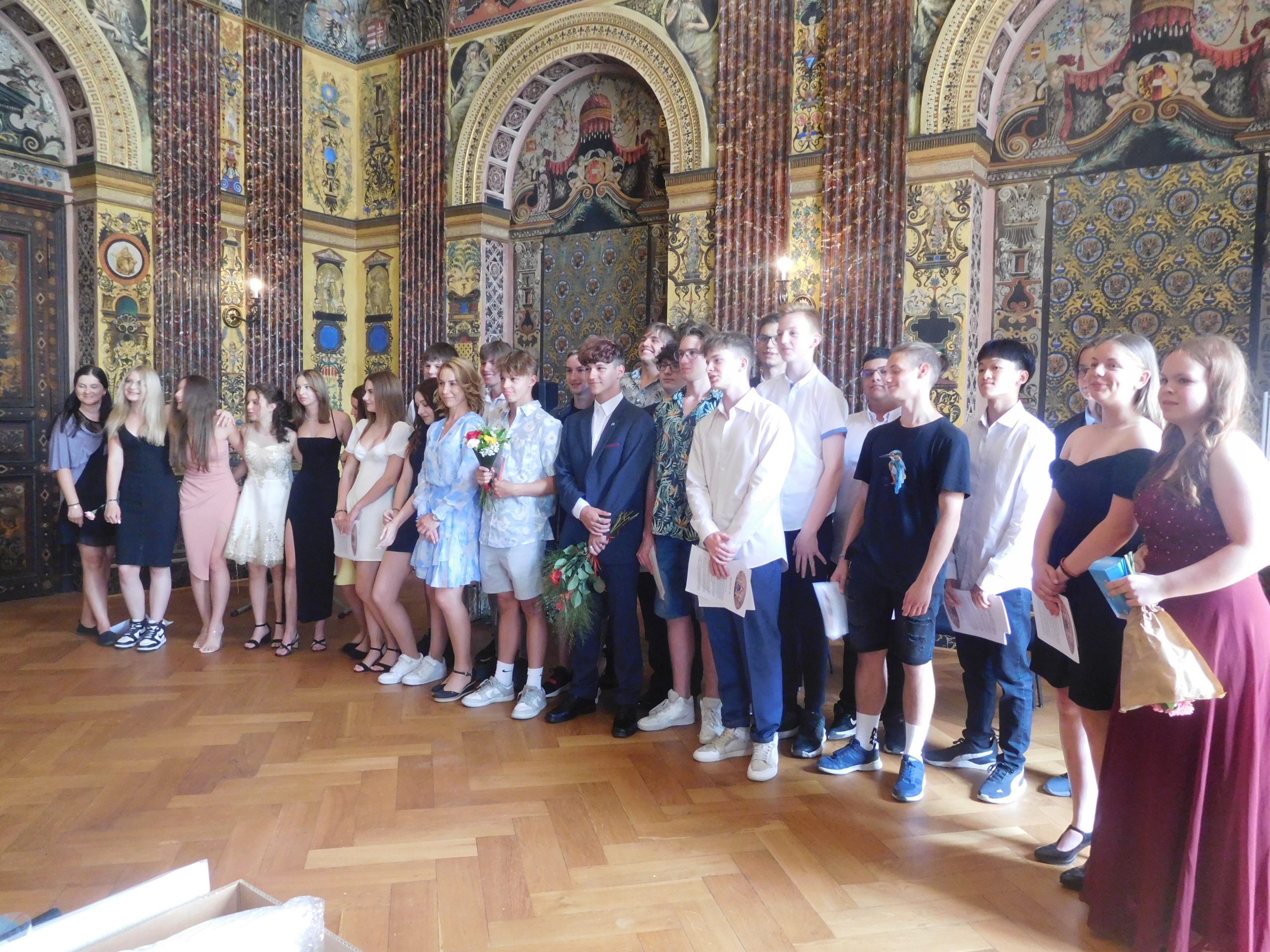 Ano, je to tady! Po devíti letech docházky nás opouštějí ti naši nejstarší. A my ostatní jsme se s nimi slavnostně rozloučili. A kde jinde než ve freskovém sále školy. Za účasti představitelů města Olomouce, vedení školy, všech učitelů, kteří je od první třídy učili, samozřejmě také rodičů si převzali své poslední vysvědčení na základní škole, pamětní list a knížku s přáními pedagogů. I oni si připravili pro své učitele poděkování a dárečky. Také díky hudebním vystoupením i české hymně byla atmosféra opravdu slavnostní a dojemná, objevila se i nejedna slzička. Vždyť jim začíná další etapa života – po zasloužených prázdninách nastoupí na střední školy. Všichni se na ně dostali a my jim přejeme, aby byli spokojení a úspěšní.