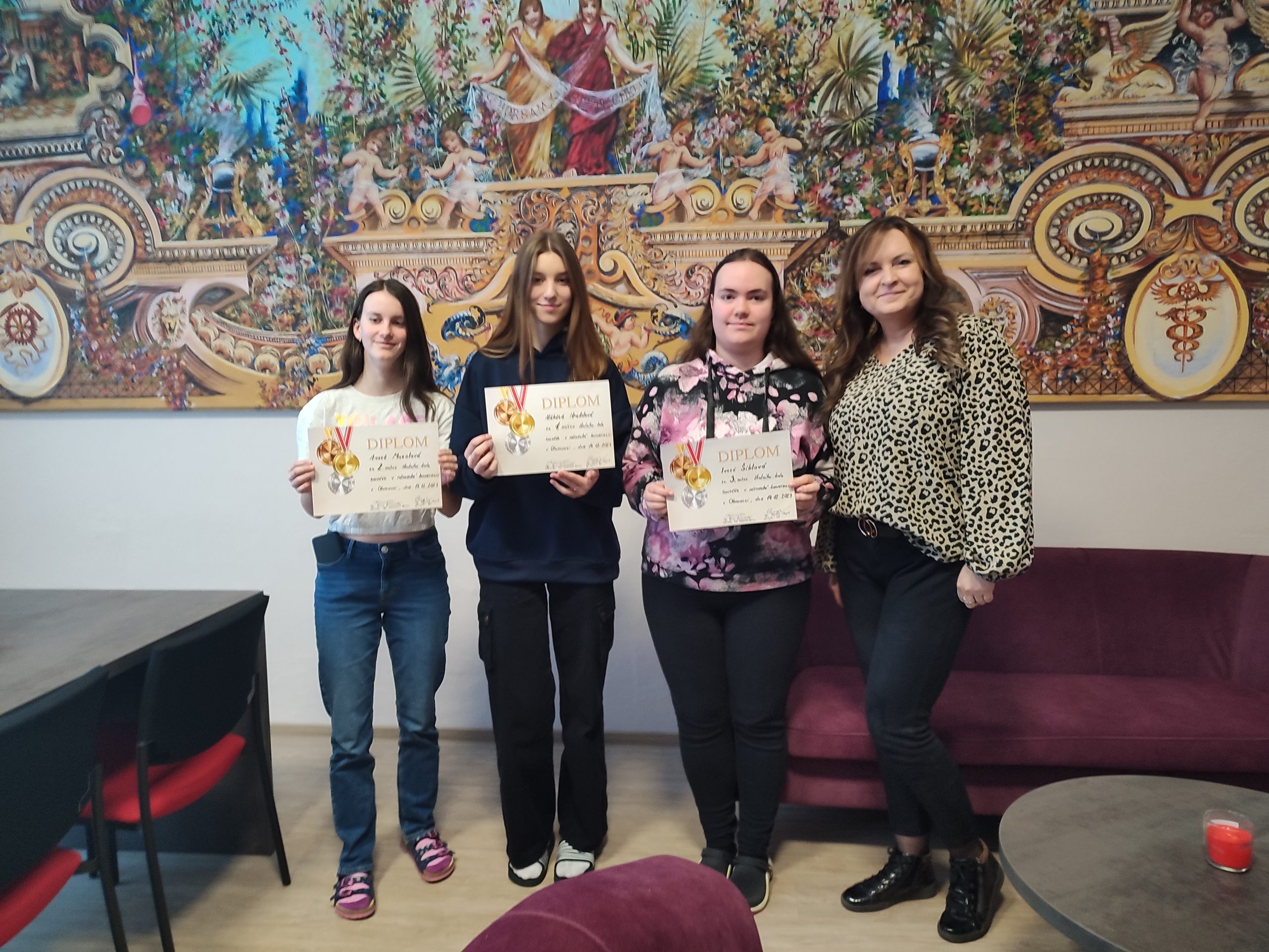 Z těsného souboje vyšla vítězně Alžběta Hradilová, na druhém místě Aneta Mazalová a bronz brala Iveta Šíblová. Všechny žákyně 9. A. Vítězkám gratulujeme a ze dvou prvních míst postupují soutěžící do kola okresního, které proběhne v Olomouci v únoru tohoto roku. Držme jim pěsti!!!