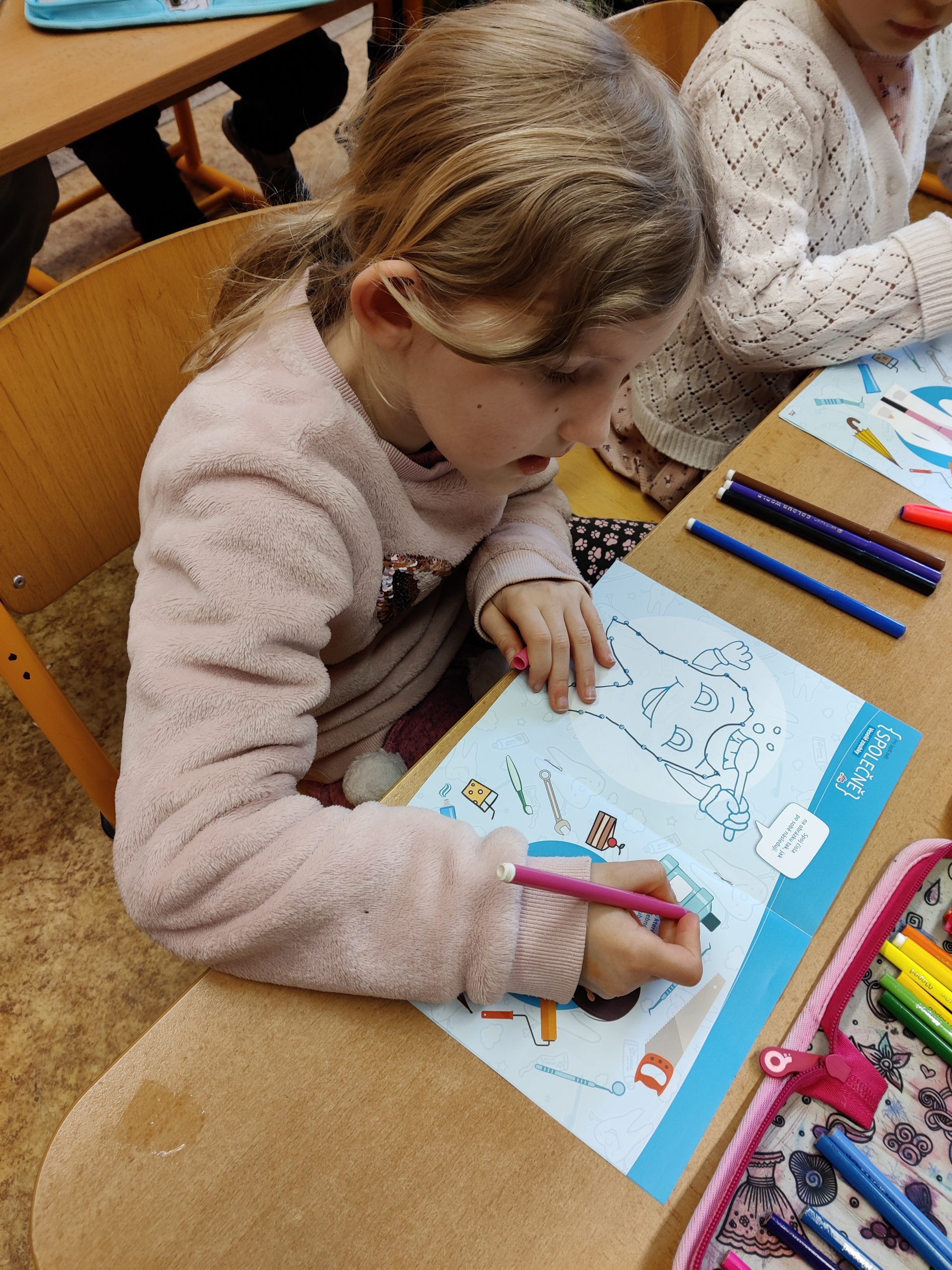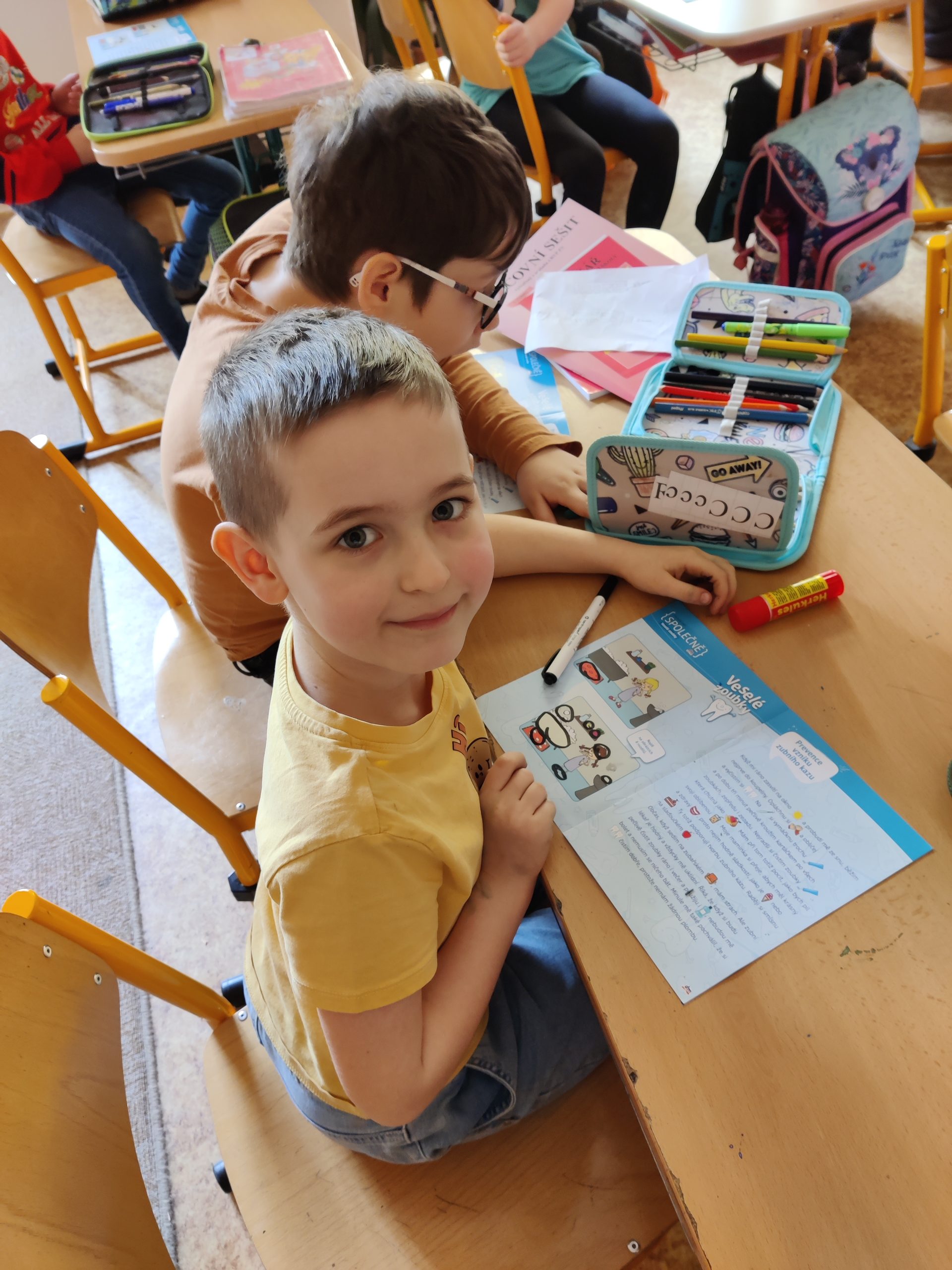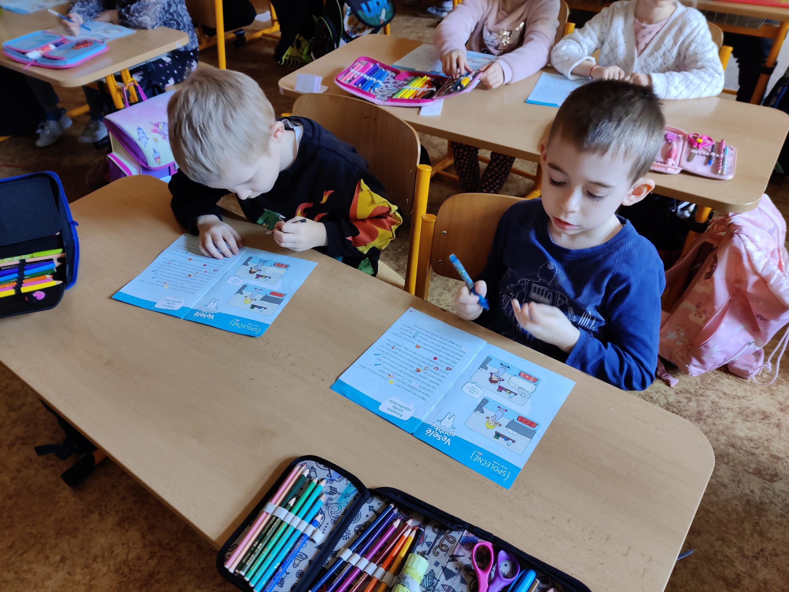 Během hodiny, kterou je provázeli třídní učitelky, se seznámili s tím, jak zoubky fungují, k čemu je máme, jak rostou, mění se a co je zubní kaz. Nesmělo také chybět probrání zásad správné péče o zoubky, seznámení se s návštěvami zubního lékaře, a dokonce podívání se na zoubek i samotnému Hurvínkovi. Na závěr prvňáčci všechny získané informace využili při vyplňování pracovního listu a za odměnu na ně čekaly preventivní balíčky.